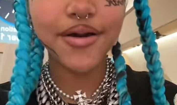 On her joint account along with her mom, @kimandnorth, North appeared with faux face tattoos, a nostril ring, black grillz, and blue braids, paired with shiny blue contacts and outsized streetwear.
