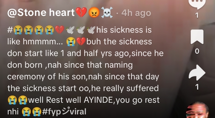 ”See as e lean 😭. The illness is an excessive amount of for him, he’s too small for that sort of illness. He actually endure. Relaxation on Ayinde. I actually miss you right here”, The video’s caption reads.