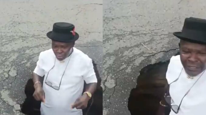 “This pothole right in the middle of the road here in Nembe will definitely cause a big accident if nothing is done about it. Just look at the size of this hole — a whole human being like me can stand comfortably inside it,” he said.