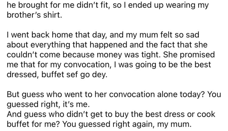 But guess who went to her convocation alone today? You guessed right, it’s me. And guess who didn’t get to buy the best dress or cook buffet for me? You guessed right again, my mum.”