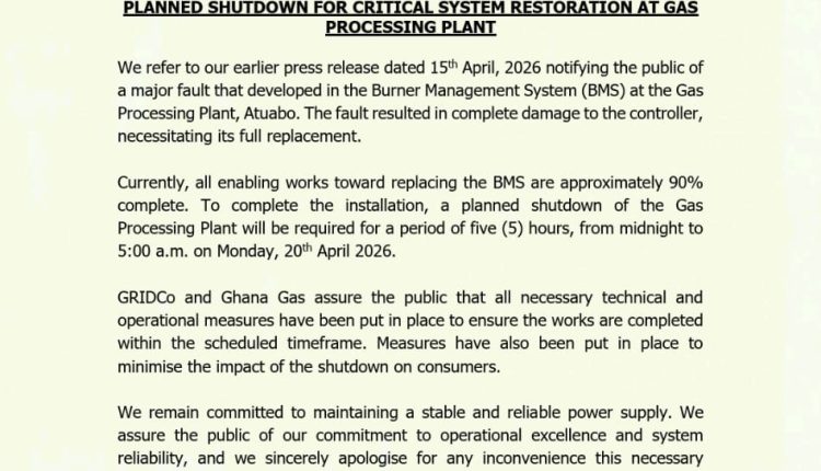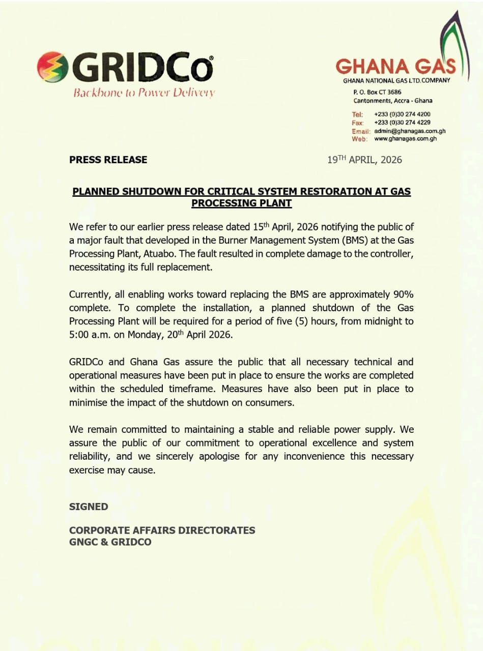 The Ghana Grid Company Limited (GRIDCo) and the Ghana National Gas Company have announced a temporary shutdown of the Atuabo Gas Processing Plant to carry out essential repair works.