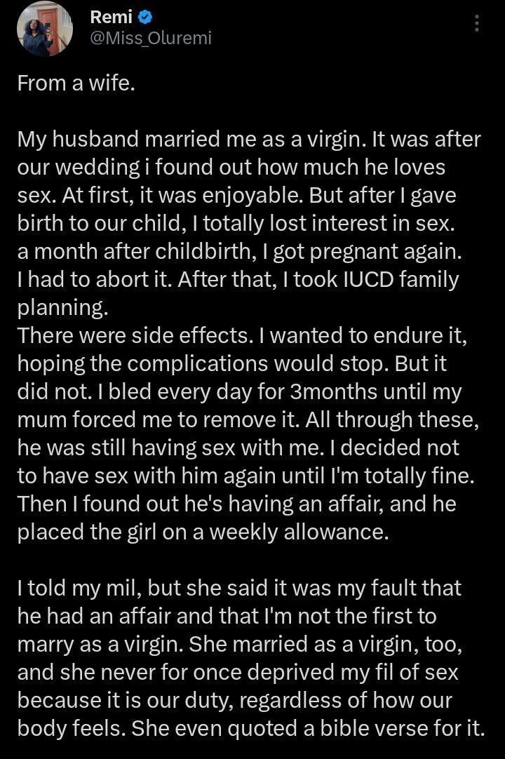 In a post circulating on social media, the woman explained that her husband married her as a virgin and initially, their intimate life was satisfying.
