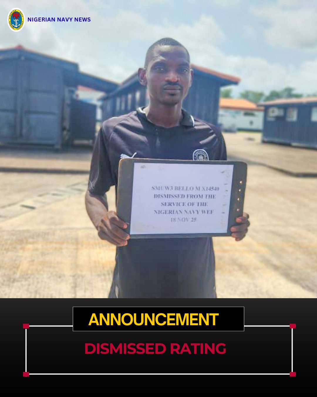 The Nigerian Navy has announced the dismissal of SMUW Bello MX14540 from Service. The rating was found culpable of desertion from naval service after an absence without official leave for 1346 days. Read Also Navy Neutralises IPOB IED Cell, Destroys Explosives in ImoNavy Busts Illegal Fuel Shipment, Arrests Eight Suspects……