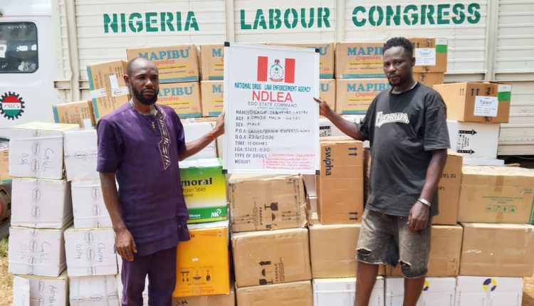 The Edo State Command of the National Drug Law Enforcement Agency (NDLEA) has intercepted an alleged Nigerian Labour Congress (NLC) truck conveying 748.02kg of tramadol and arrested two suspects along the Benin-Lagos Expressway.