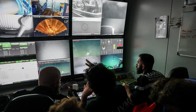 Pilots specializing in underwater robots from the French Navy, along with researchers, watch live feeds on screens showing the “ROV C 4000,” a remotely operated vehicle, during an archaeological mission on the wreck of the CAMARA 4 in southeastern France, April 7, 2026.