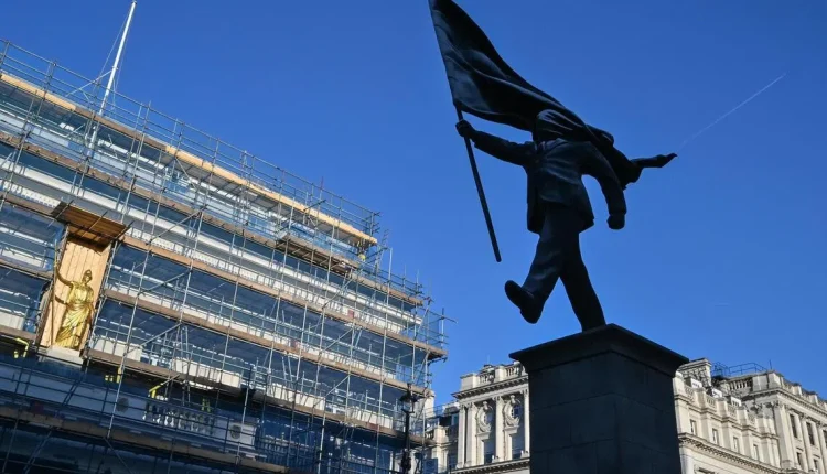The statue – of a suited man marching, with one leg off the plinth, while carrying a flag that is covering his face – reportedly first emerged on April 29 just off the central street of Pall Mall.