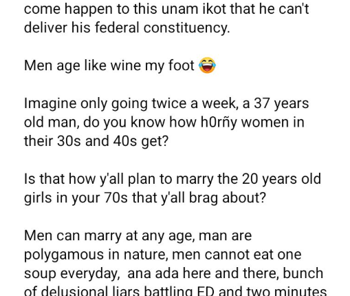 “Men can marry at any age, man are polygamous in nature, men cannot eat one soup everyday, ana ada here and there, bunch of delusional liars battling ED and two minutes syndrome.