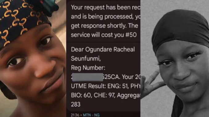 A screenshot attached to the now-viral tweet shows @only_rechael’s JAMB score which was 75 in Physics, 51 in English, and 97 in Chemistry, totaling an aggregate of 283.